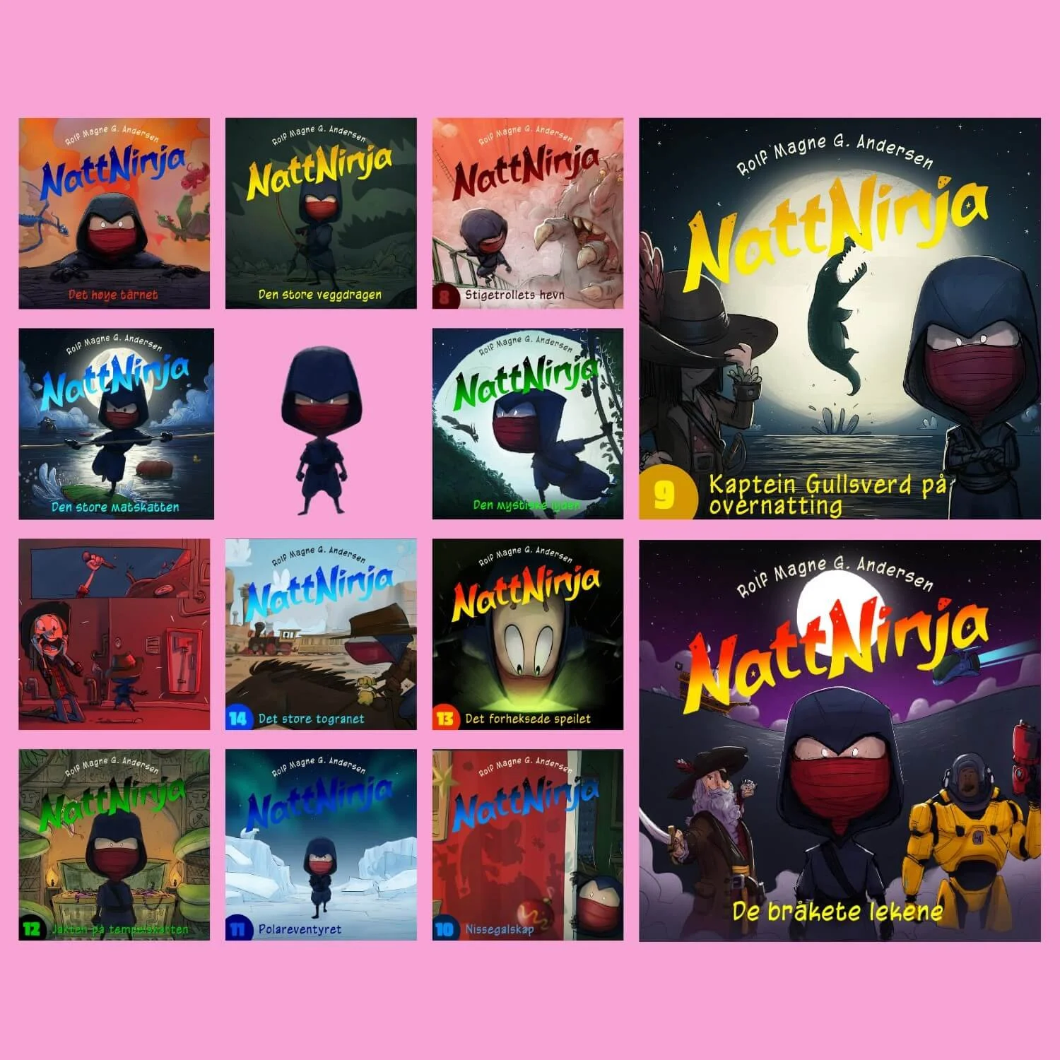 I fortellingene om Nattninja blir du med på alt det eventyrlige som venter når Martin under dekke av kveldsmørket forvandler seg til en ninja. Da blir også alt rundt ham omskapt til fortryllede landskap. Nattninjaen trosser farer på de syv hav, sliter seg frem gjennom snødekte vidder og kjemper mot både troll og ville nisser. Men etter at han har løst opp i kveldens floke, venter heldigvis en god natts søvn tilbake i trygge omgivelser. Nattninja-bøkene er illustrert med den lekne, humoristiske og vakre streken til Bård Sletvold Torkildsen.
